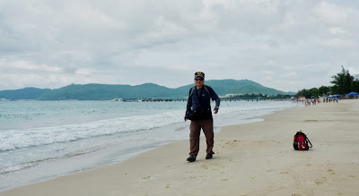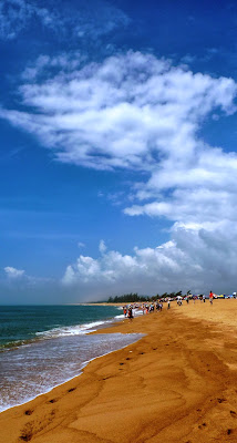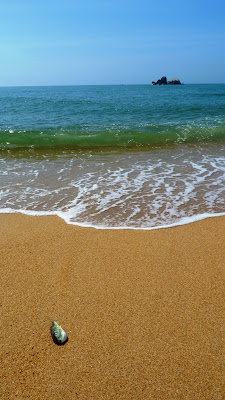 臨海浩瀚難極目, 金光閃爍浪濤沙....