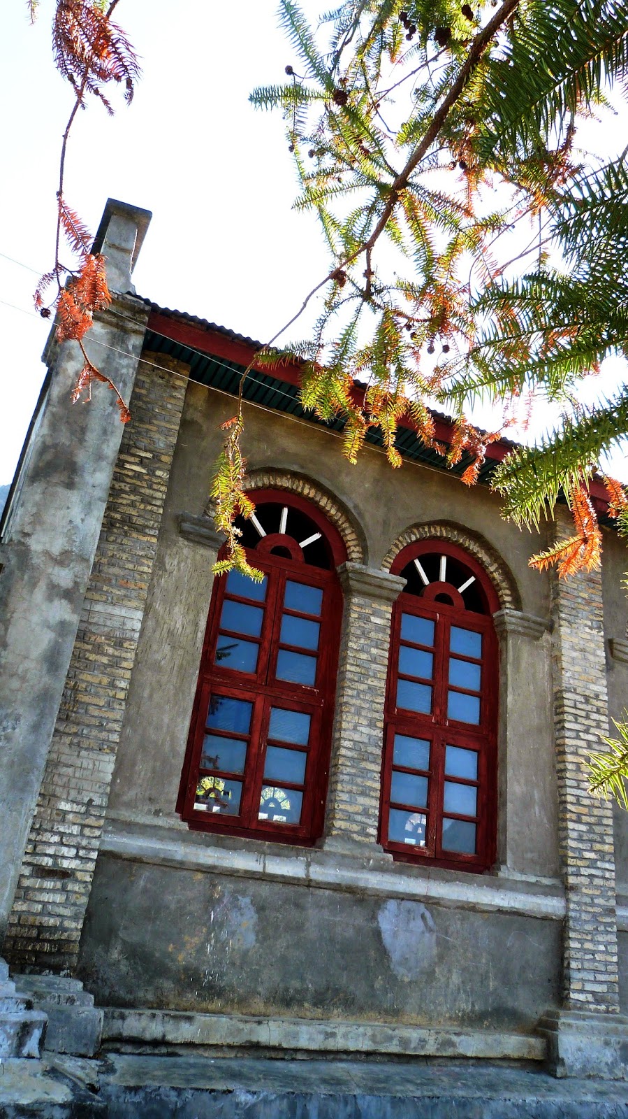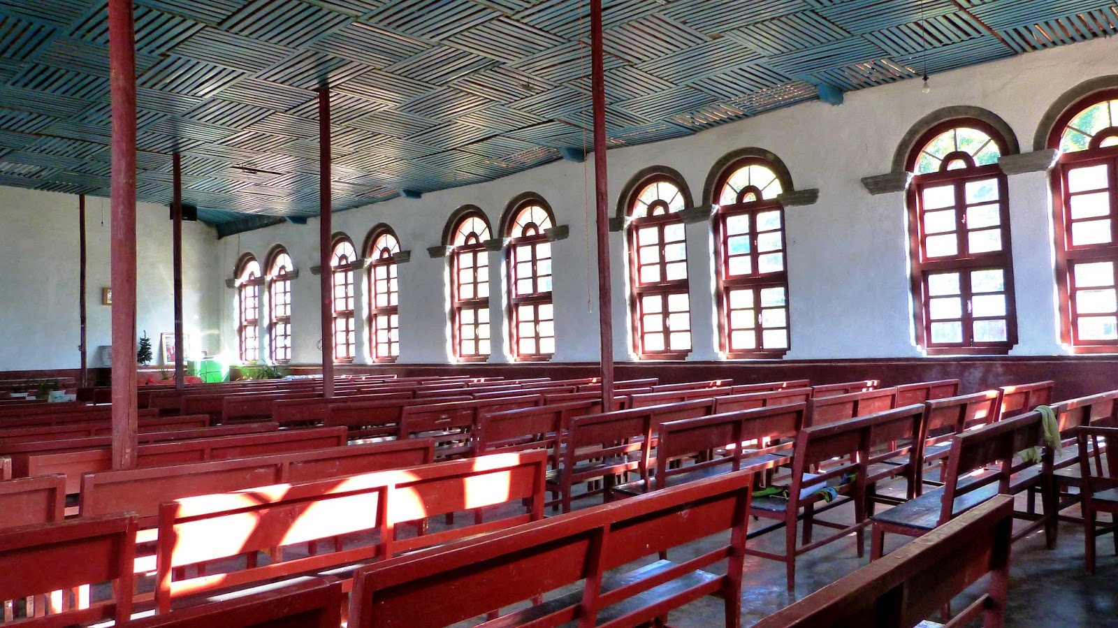 只有極其簡單的佈置,青磚牆、紅漆圓拱木窗、白鐵皮屋頂、長條凳,