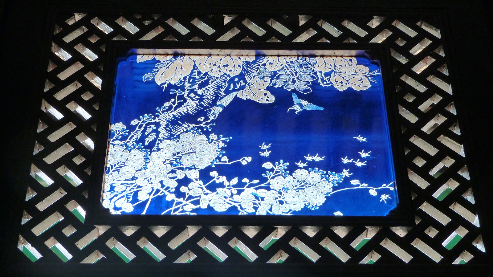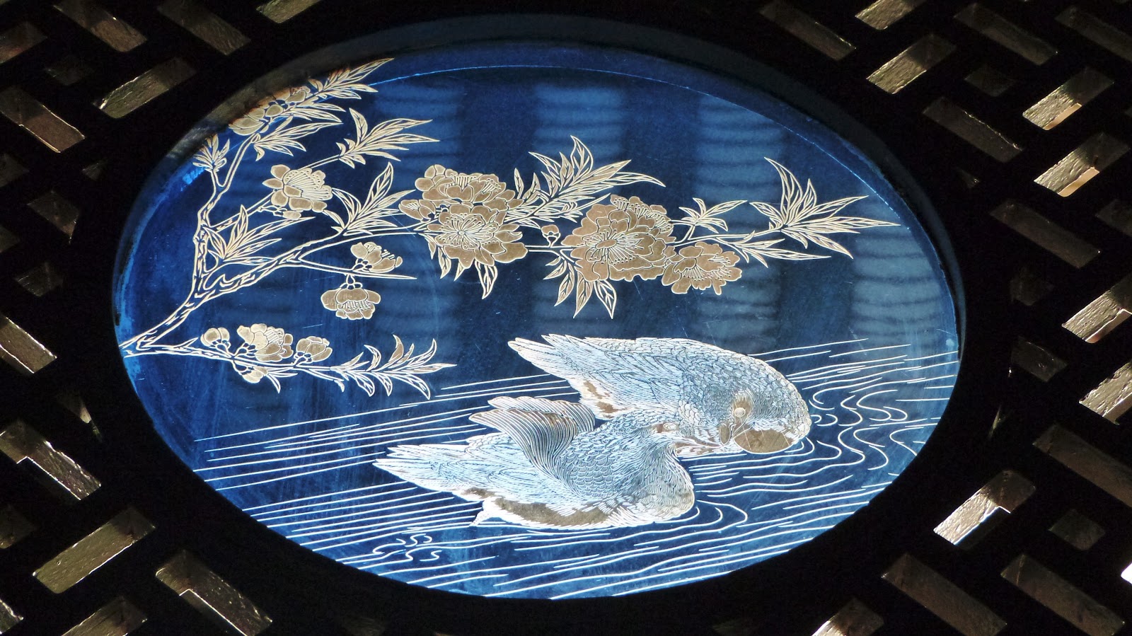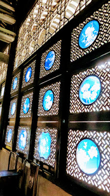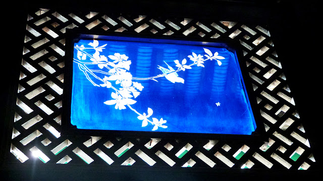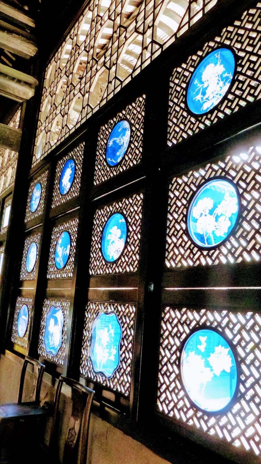 尤具特色的還有第二進後側長廊上的柚木屏門雙面鏤雕,